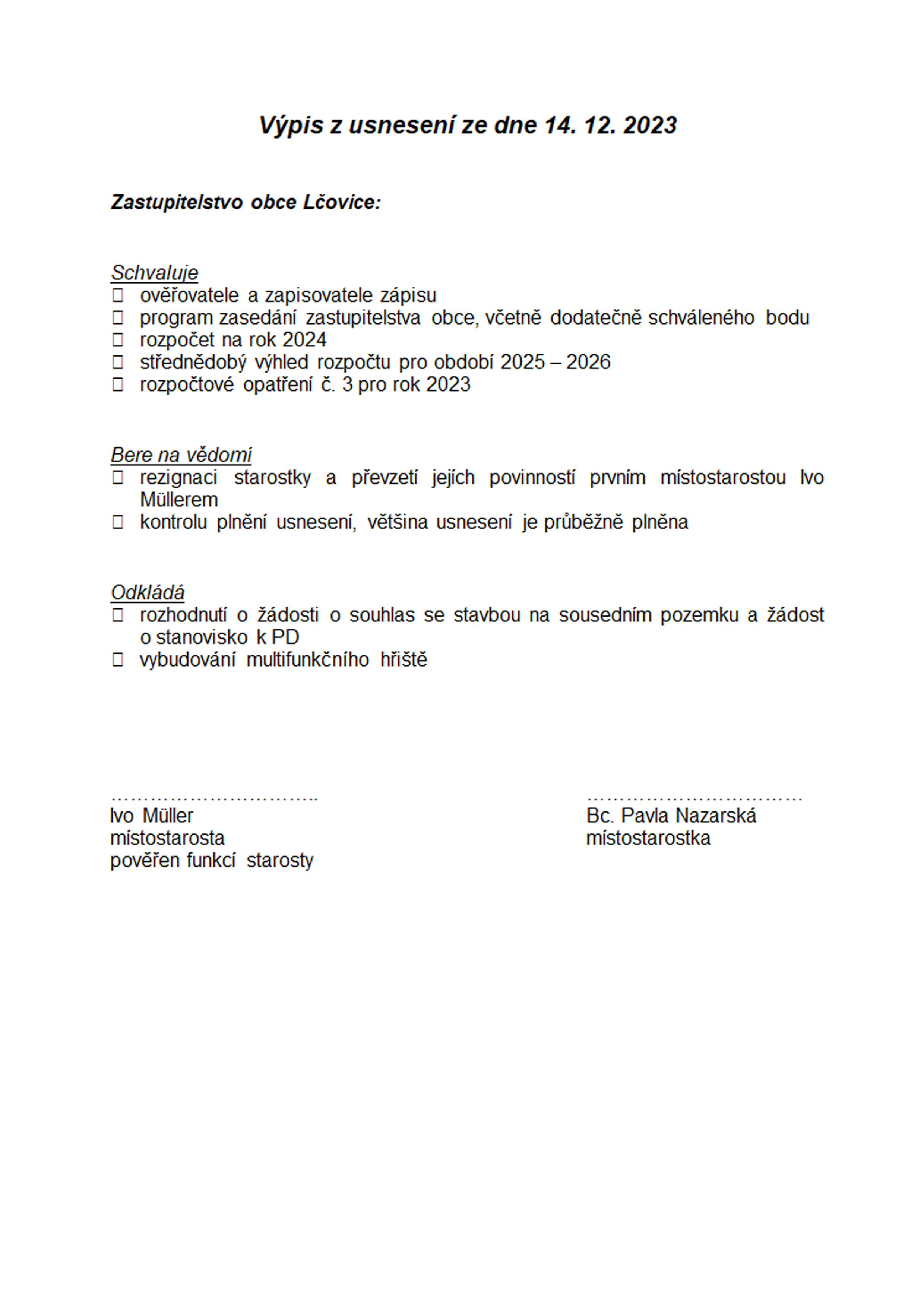 Usnesení ze zasedání zastupitelstva